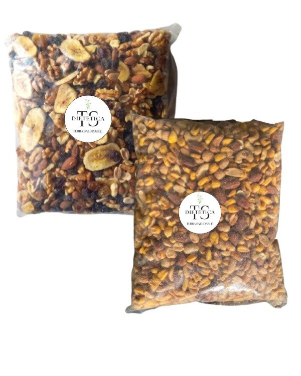 1k Mix energia con bananas: Nueces, almendras, maní, chips de banana, pasas rubias y morenas.
